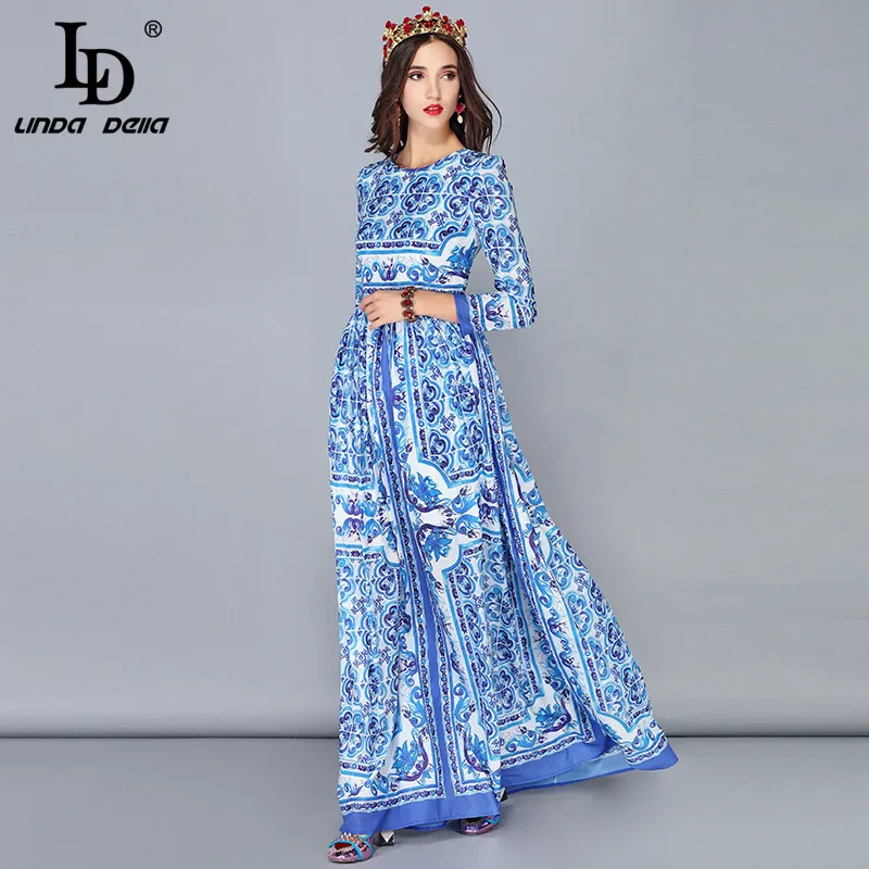 Good Product LD LINDA DELLA New Fashion Runway Maxi Dresses Women's Long Sleeve Vintage Casual Chiffon Blue and